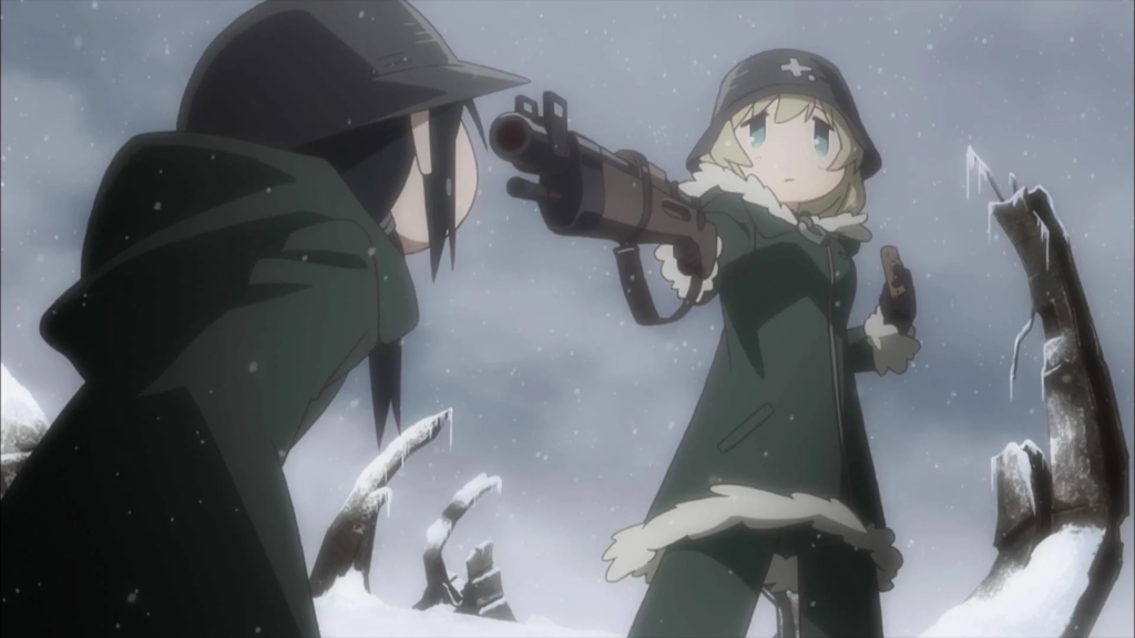 But then Episode 6 happens. The library episode. Chito and Yuuri find a massive archive—humanity’s preserved knowledge—and immediately start burning books for warmth. Not in some dramatic revolutionary gesture, but because they’re cold and books burn. The show doesn’t editorialize. It doesn’t have characters give speeches about the tragedy of lost knowledge. It just shows you two children committing cultural extinction with the same casual energy they’d use to peel potatoes. The real devastation is how reasonable it feels. You’re watching the death of human civilization and thinking, “Yeah, warmth is probably more useful than Kant right now.”