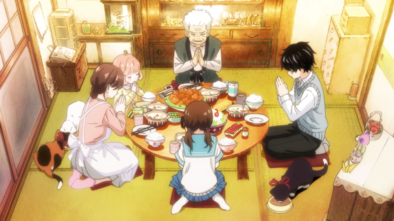 Sangatsu no Lion (March Comes in Like a Lion) takes a more direct approach: protagonist Rei Kiriyama is obviously, clinically depressed from episode one. Orphaned, isolated, using shogi as simultaneous coping mechanism and self-punishment. The show doesn’t hide this. But what it does do is bury the processing of that depression under an avalanche of mundane moments with the Kawamoto sisters—cooking, eating, New Year’s preparations, solving minor domestic problems.